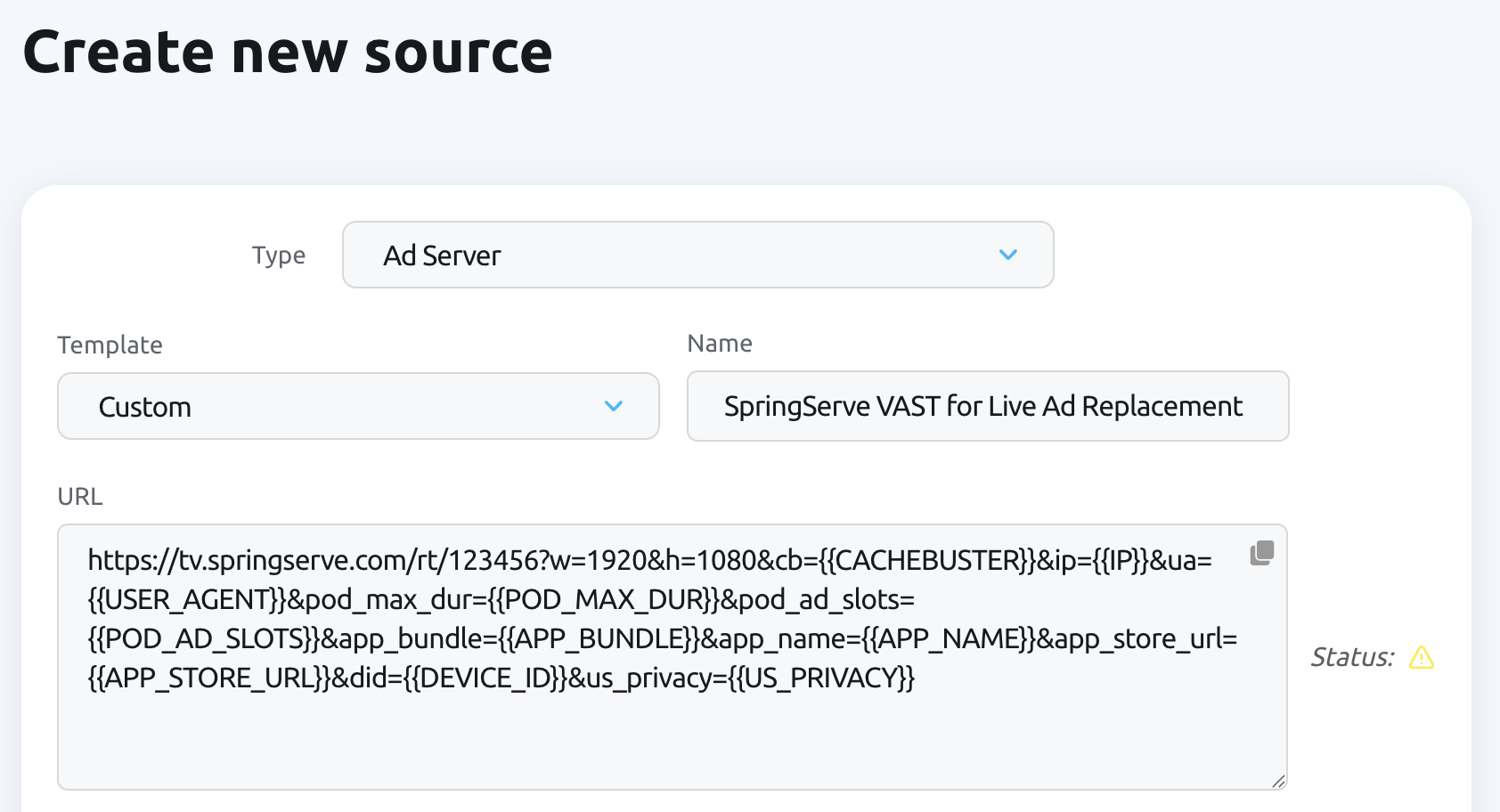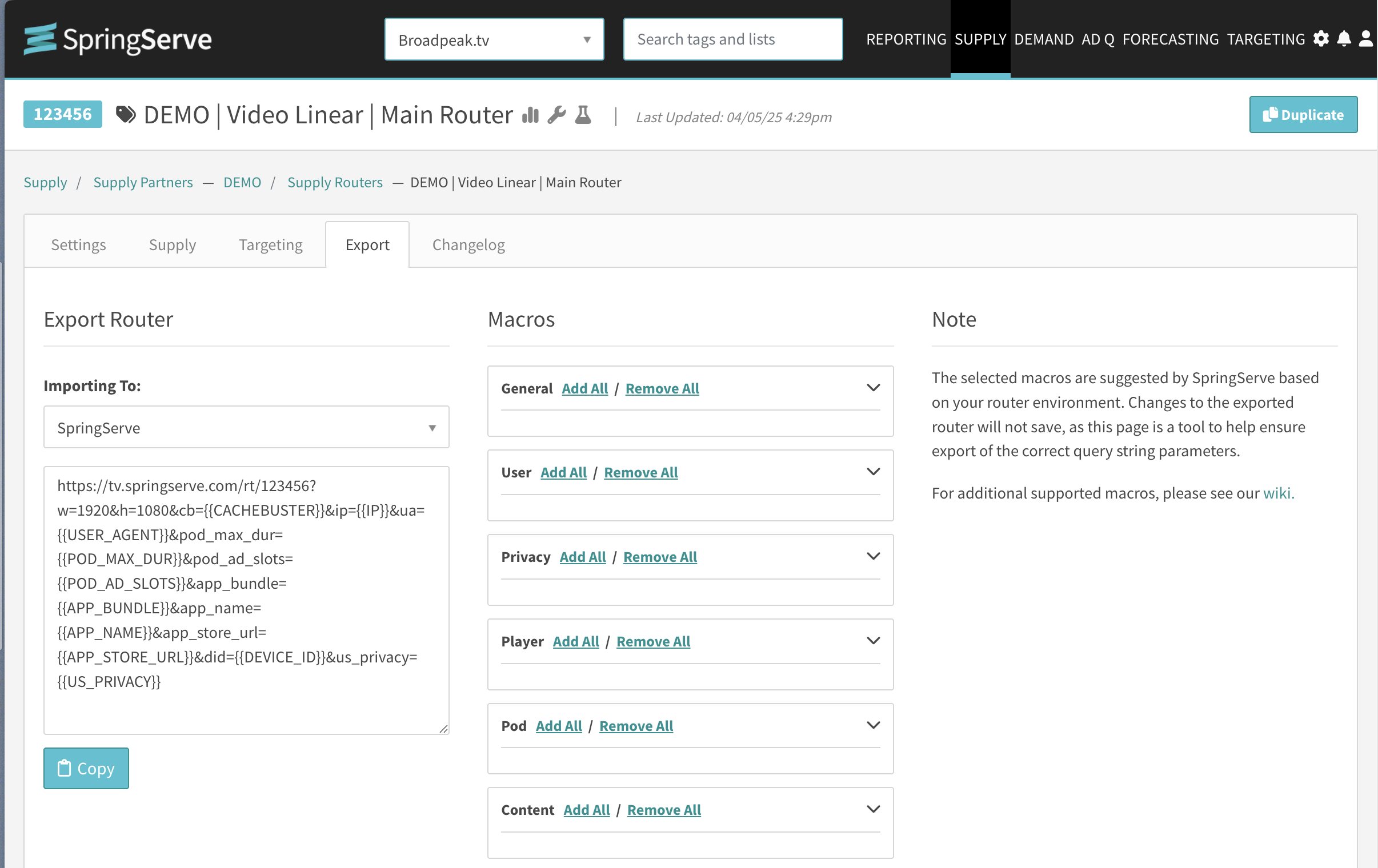 However if you have your own SpringServe account, you can easily get one from the SpringServe console, which provides a handy interface to be able to choose macros and export the URL